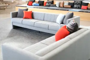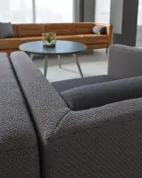 Tellaro Lounge shown in Maharam Coda 182 and Designtex Brushed Flannel Charcoal/Tellaro Lounge shown in Conneaut Como Wheat/Wixler Occasional Tables shown in Skyline Laminate Platinum