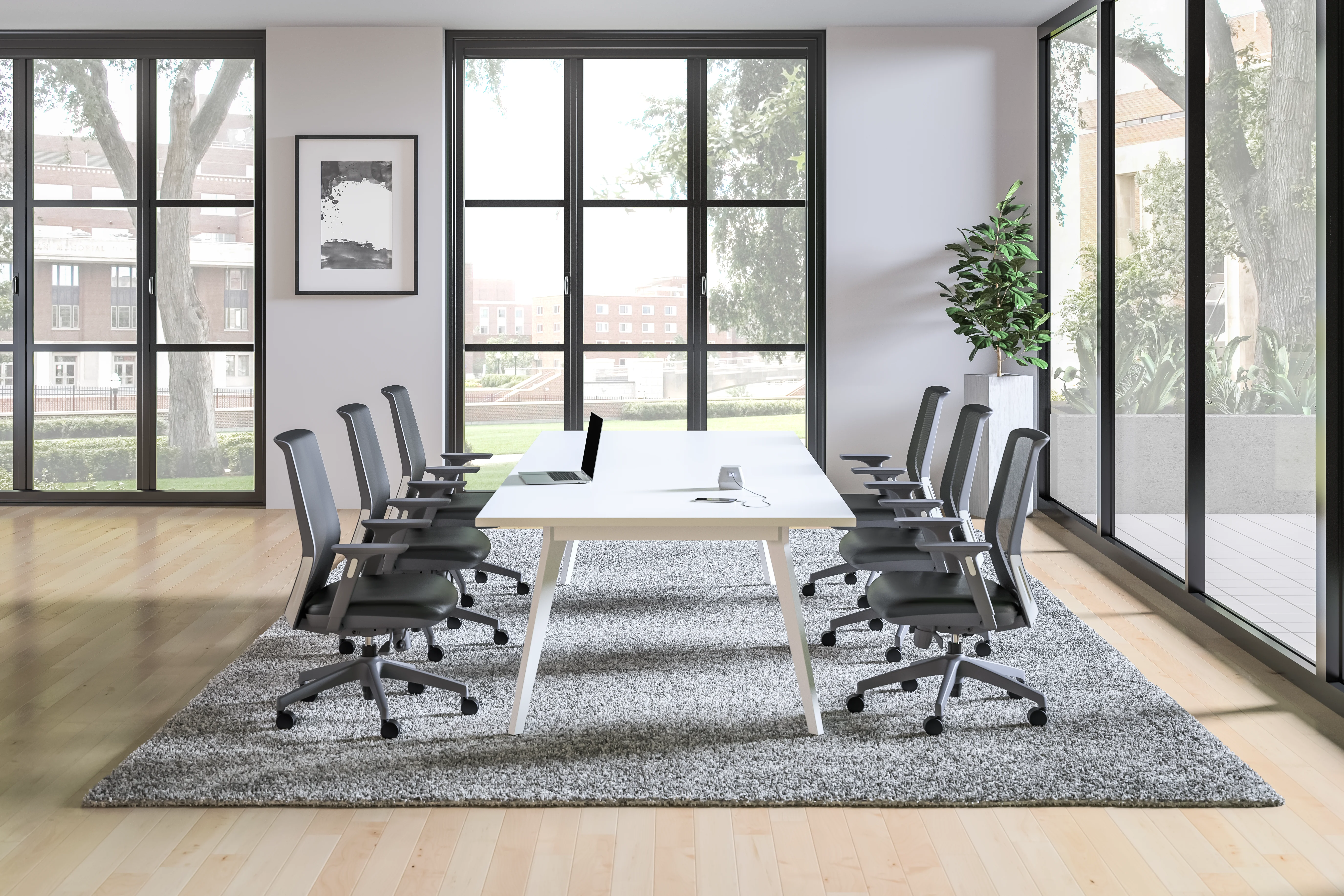Tessera Table shown in Top: White Nebbia Laminate; Legs: Iron/Tag Seating