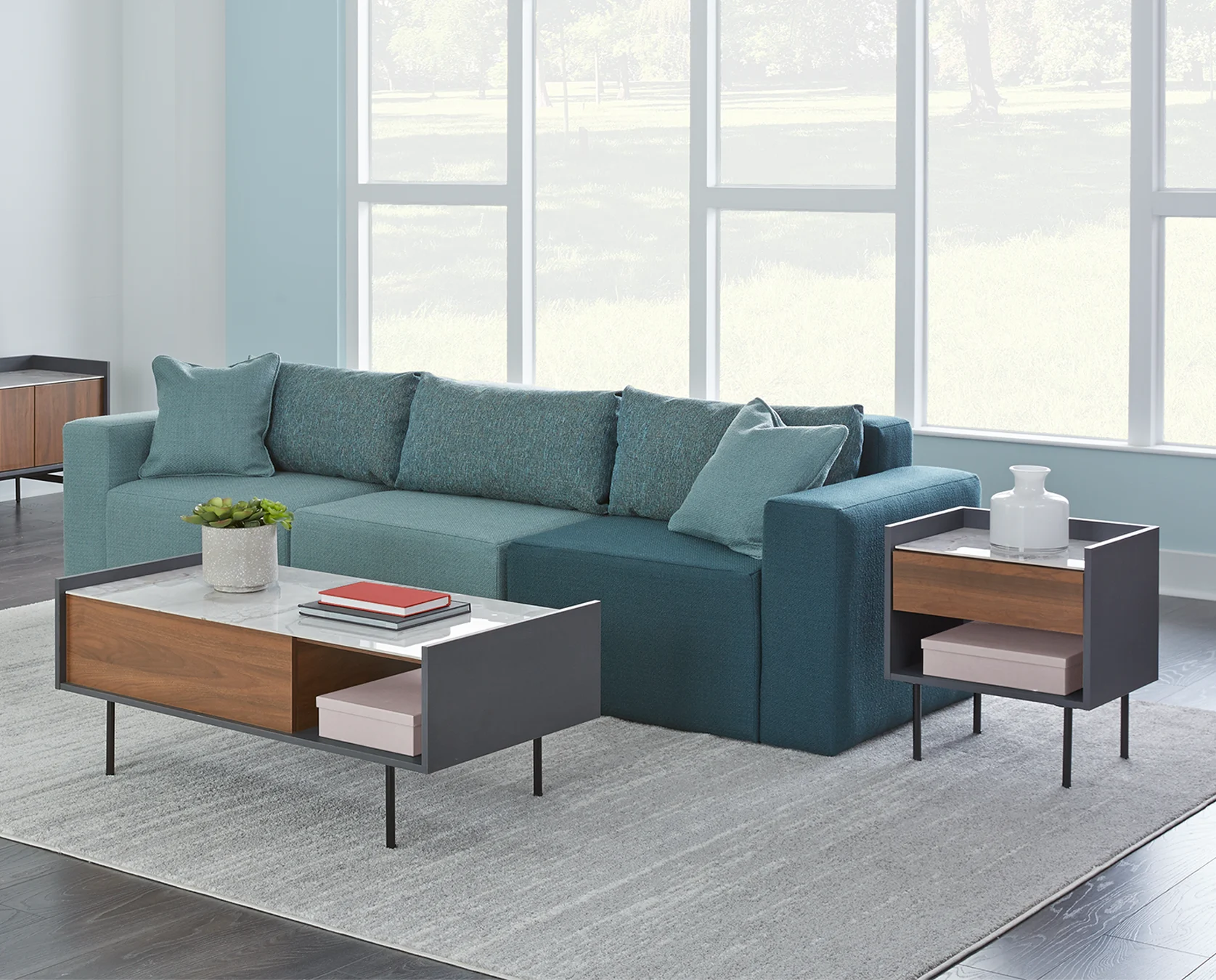 Elegant walnut gives the Xanthe family of storage an air of refinement. The coffee table and side table work as well together as they do apart, giving you supreme flexibility. (You’re going to get noticed. Be ready.)